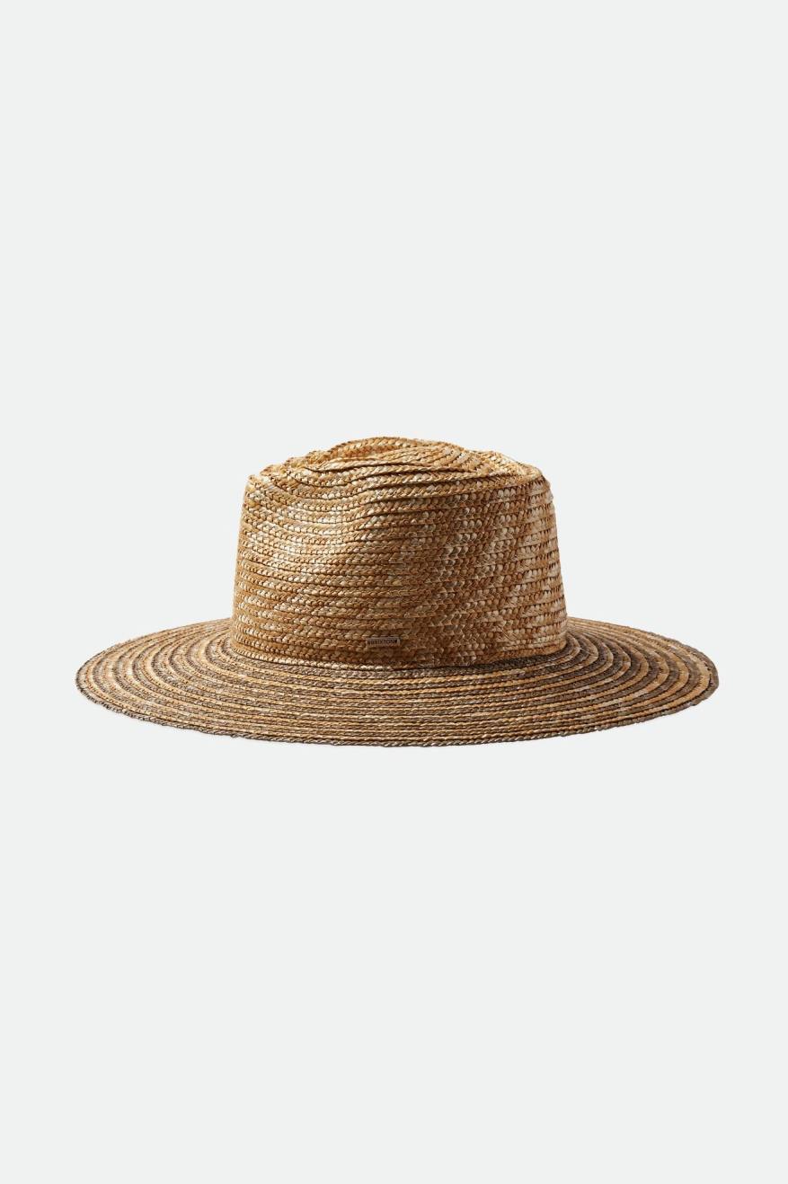The Joanna is a wheat straw hat woven with light stiffness. This version features a free crown you can customize per event. A wide brim adds extra sun protection on all sides, making this a must for blue sky soirées.