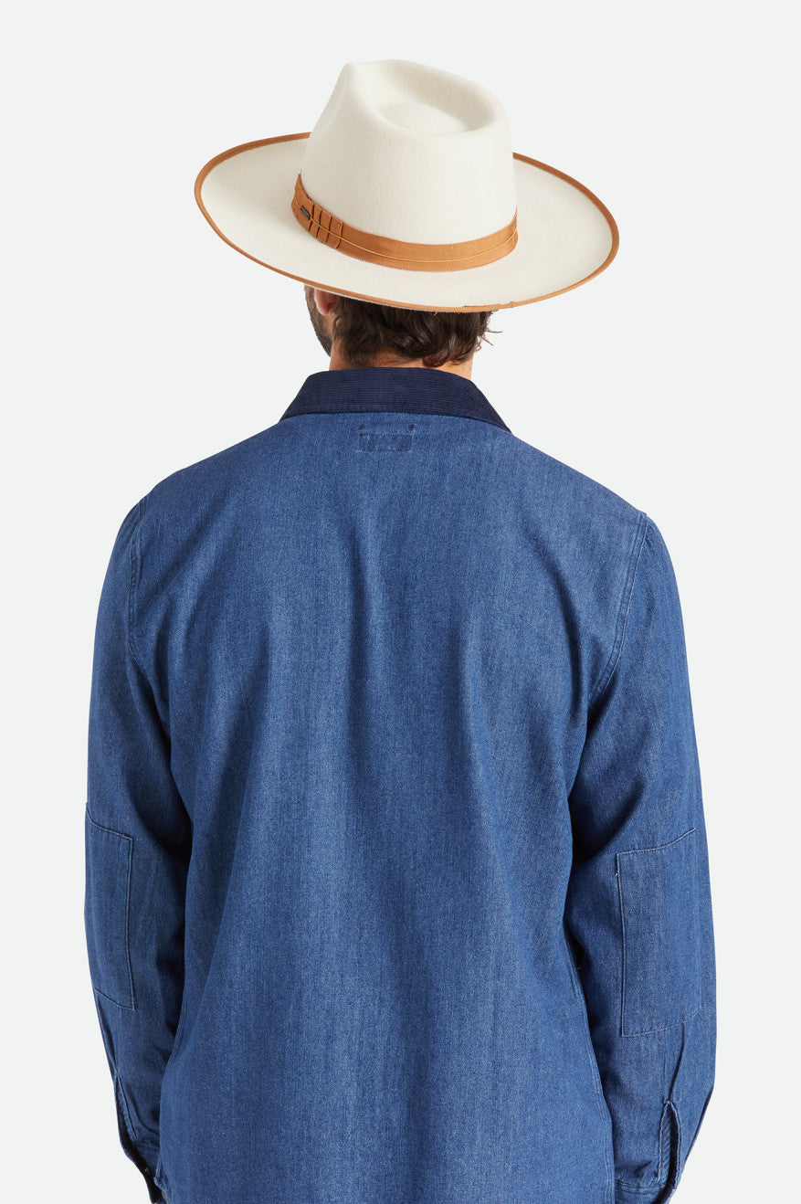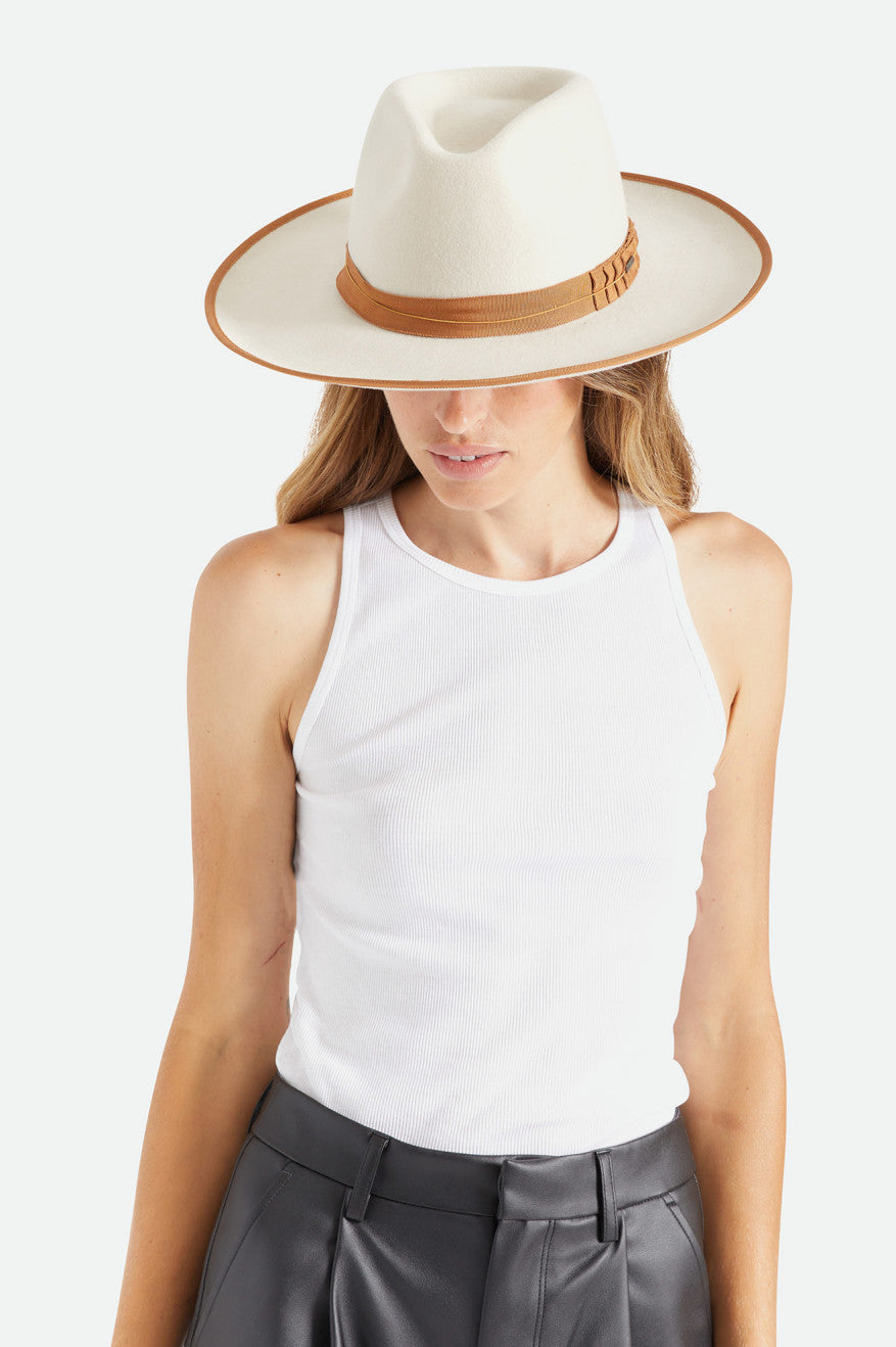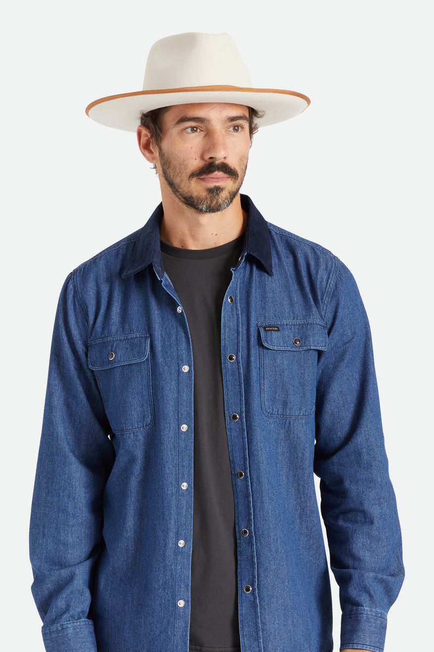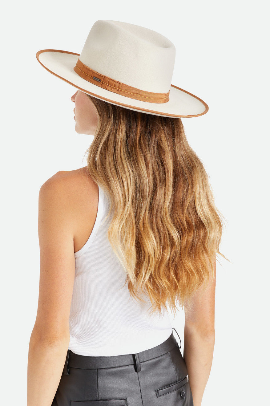 The Reno Fedora is a modern take on a heritage style. It has an iconic teardrop crease and a symmetrical front pinch. Made with Australian wool with a layered grosgrain band and brim taping.