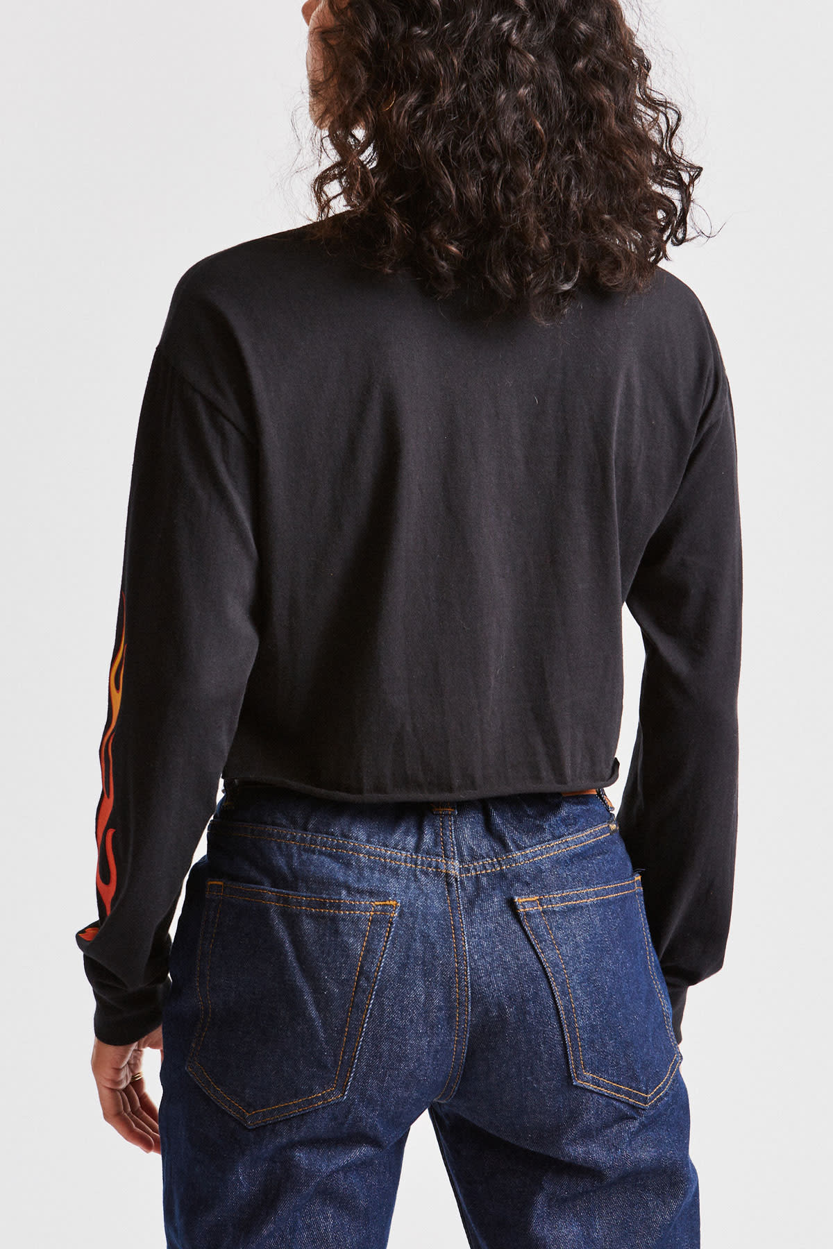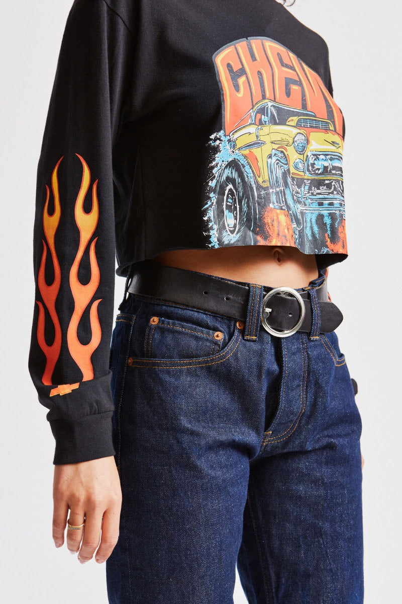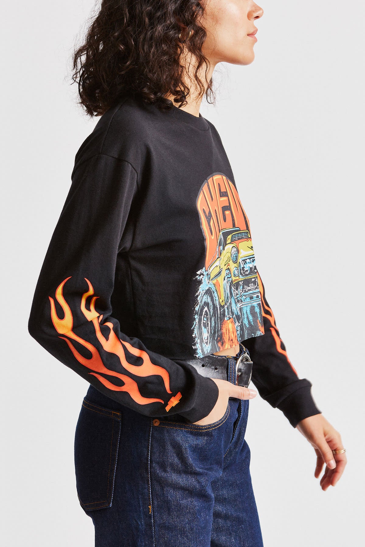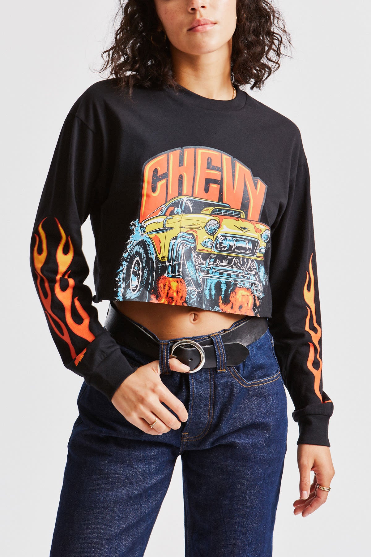 The Brixton 55 Heavy L/S Crop Tee is a long sleeve tee made in cotton/poly jersey with 1X1 rib at neckline and sleeve cuffs. It features Chevrolet logo screenprints at front body and sleeves, raw cut hem, and a woven Brixton flag label.