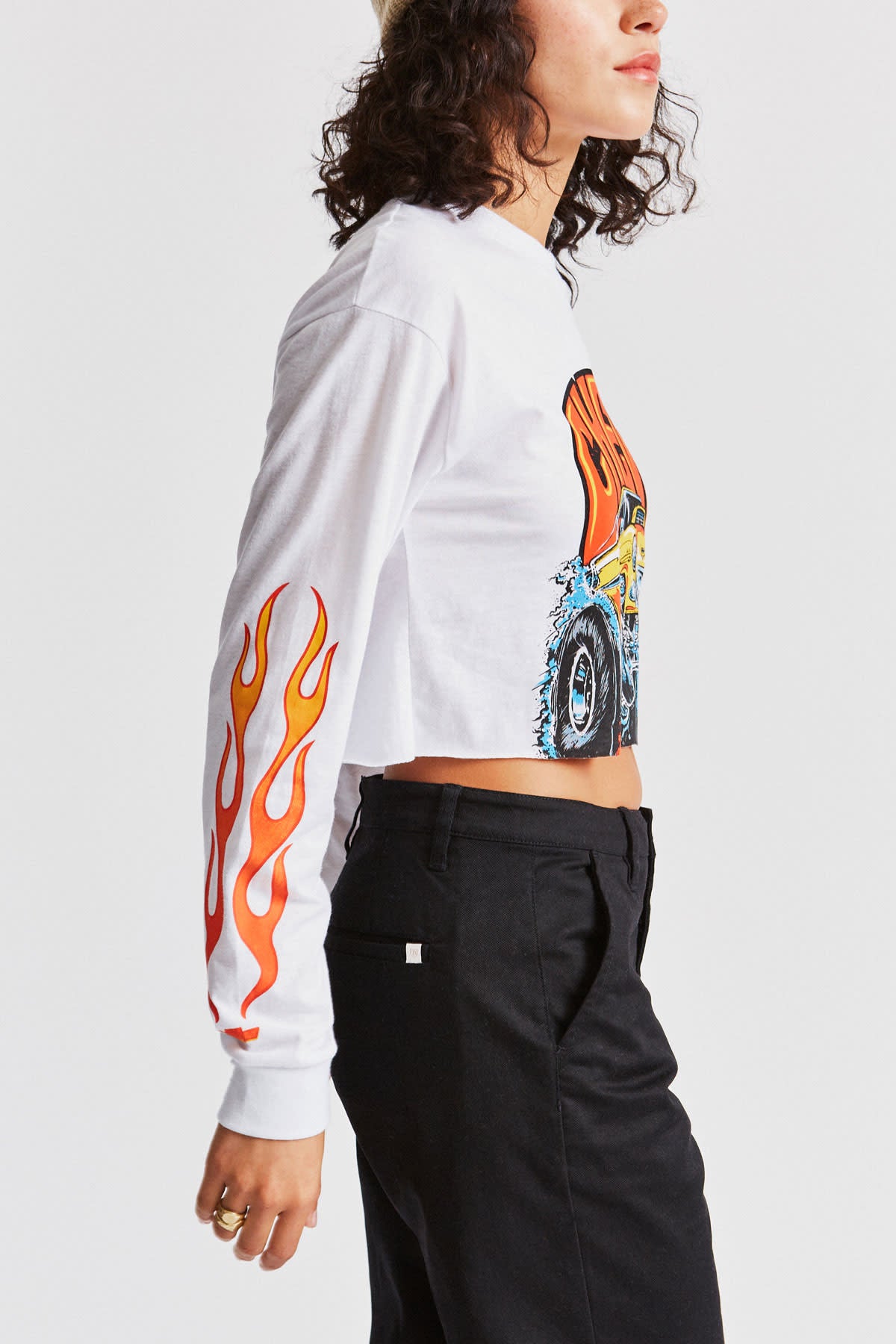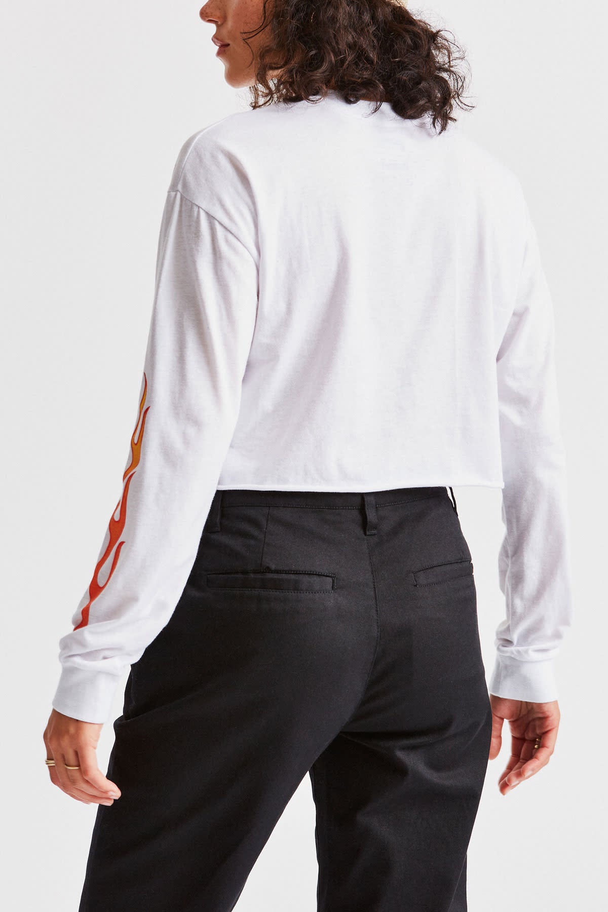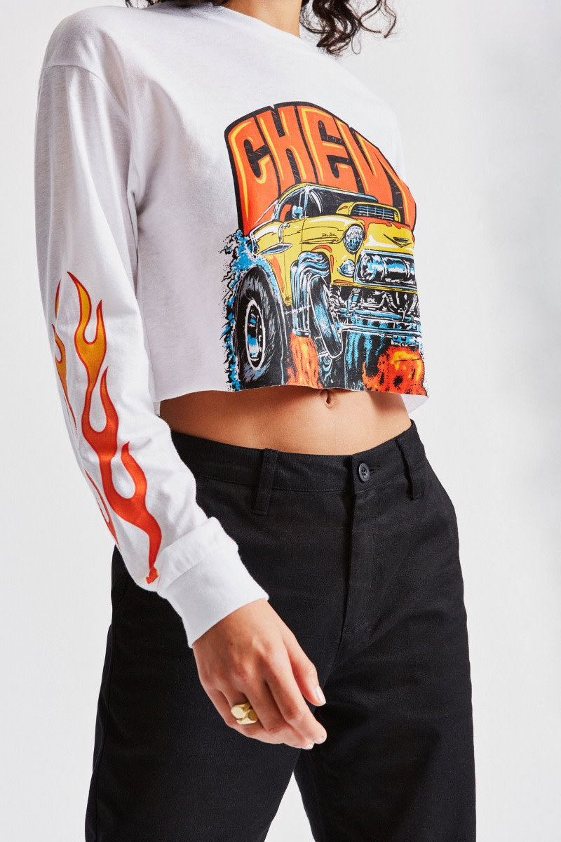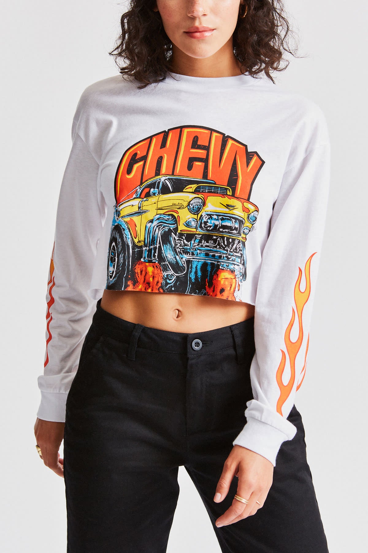 The Brixton 55 Heavy L/S Crop Tee is a long sleeve tee made in cotton/poly jersey with 1X1 rib at neckline and sleeve cuffs. It features Chevrolet logo screenprints at front body and sleeves, raw cut hem, and a woven Brixton flag label.
