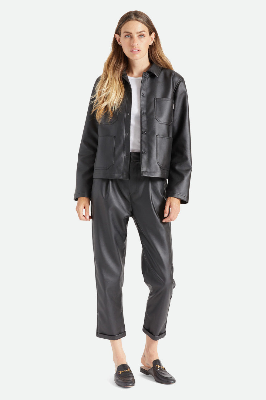 A modern take on the essential trouser, these are built with smooth and supple vegan leather accented with front pleats. High-waisted and with room to move, they're supremely comfortable and effortlessly stylish. Pair them with the Survey Boxy Chore Coat for a head-to-toe vegan leather look that will turn heads.
