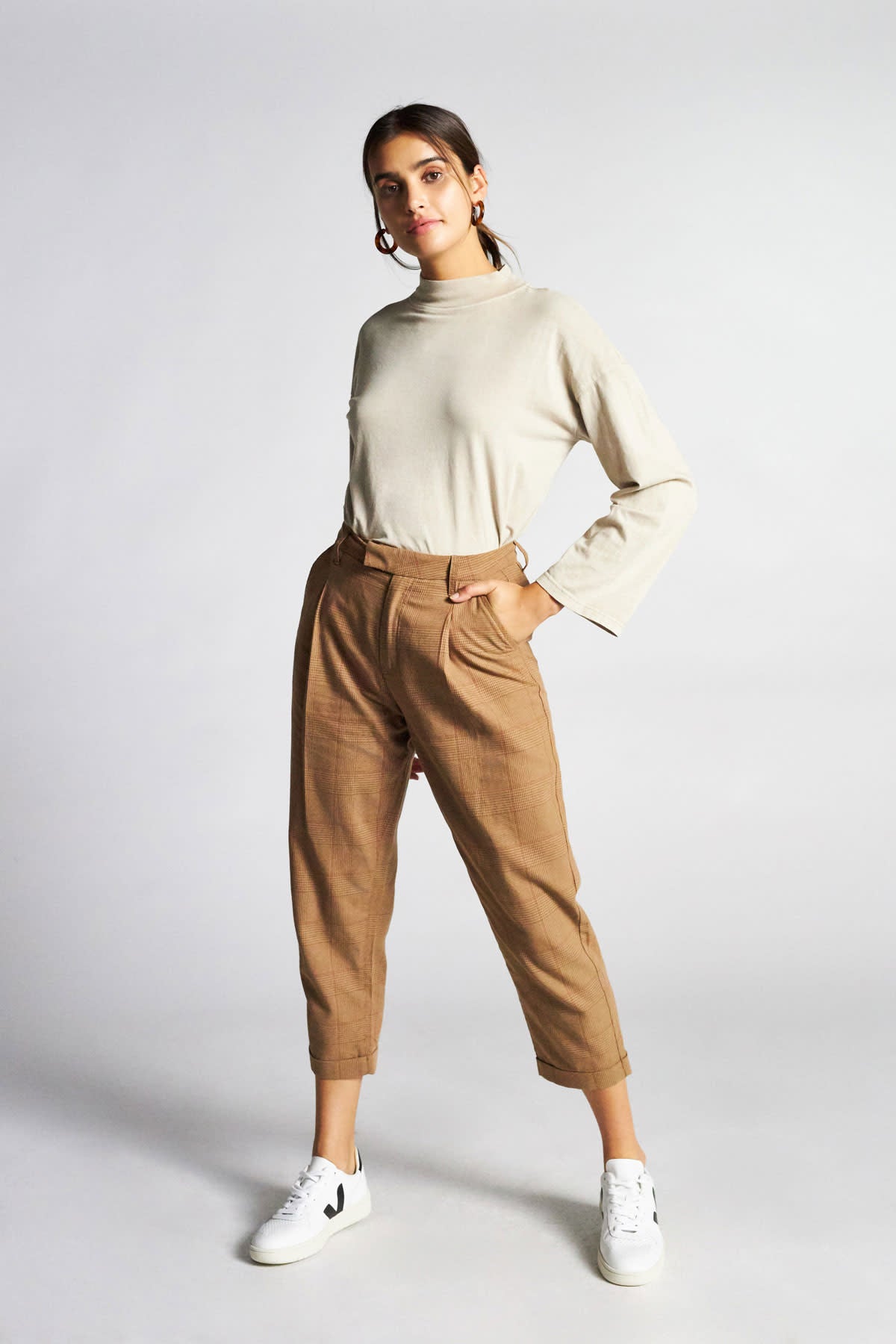 A high-rise, straight-leg pleated trouser pant made in 6-oz. cotton/polyester yarn-dyed plaid. It features front slash pockets, tailored interior waistband, rolled cuff, woven Brixton labels, a 14" leg opening, and a 24" inseam.