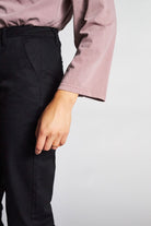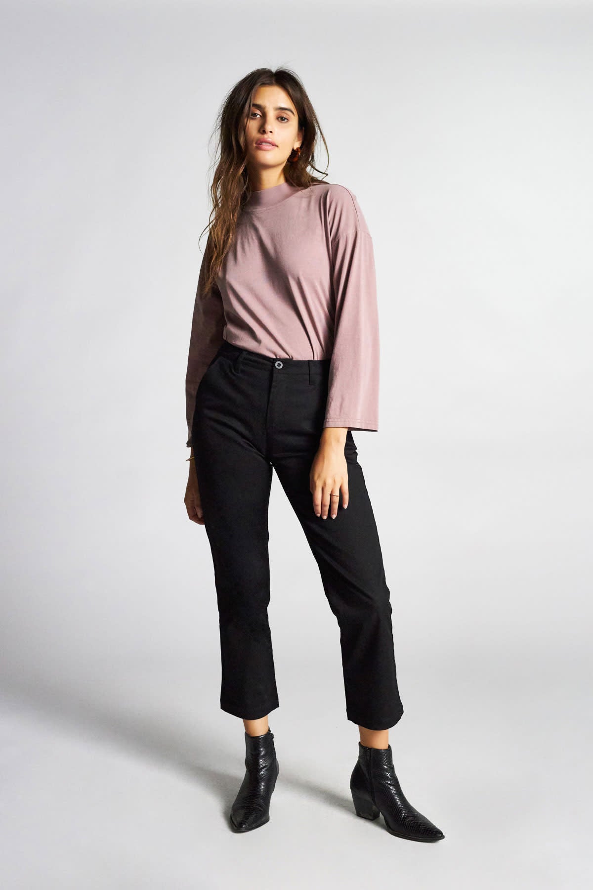 A mock neck, bracelet-length sleeve tee made in 150-gram 100% cotton pigment-dyed jersey with1x1 rib at neckline. It features a silicone softener wash, drop shoulder, extra wide sleeve opening, high mock neckline, and woven Brixton labels.
