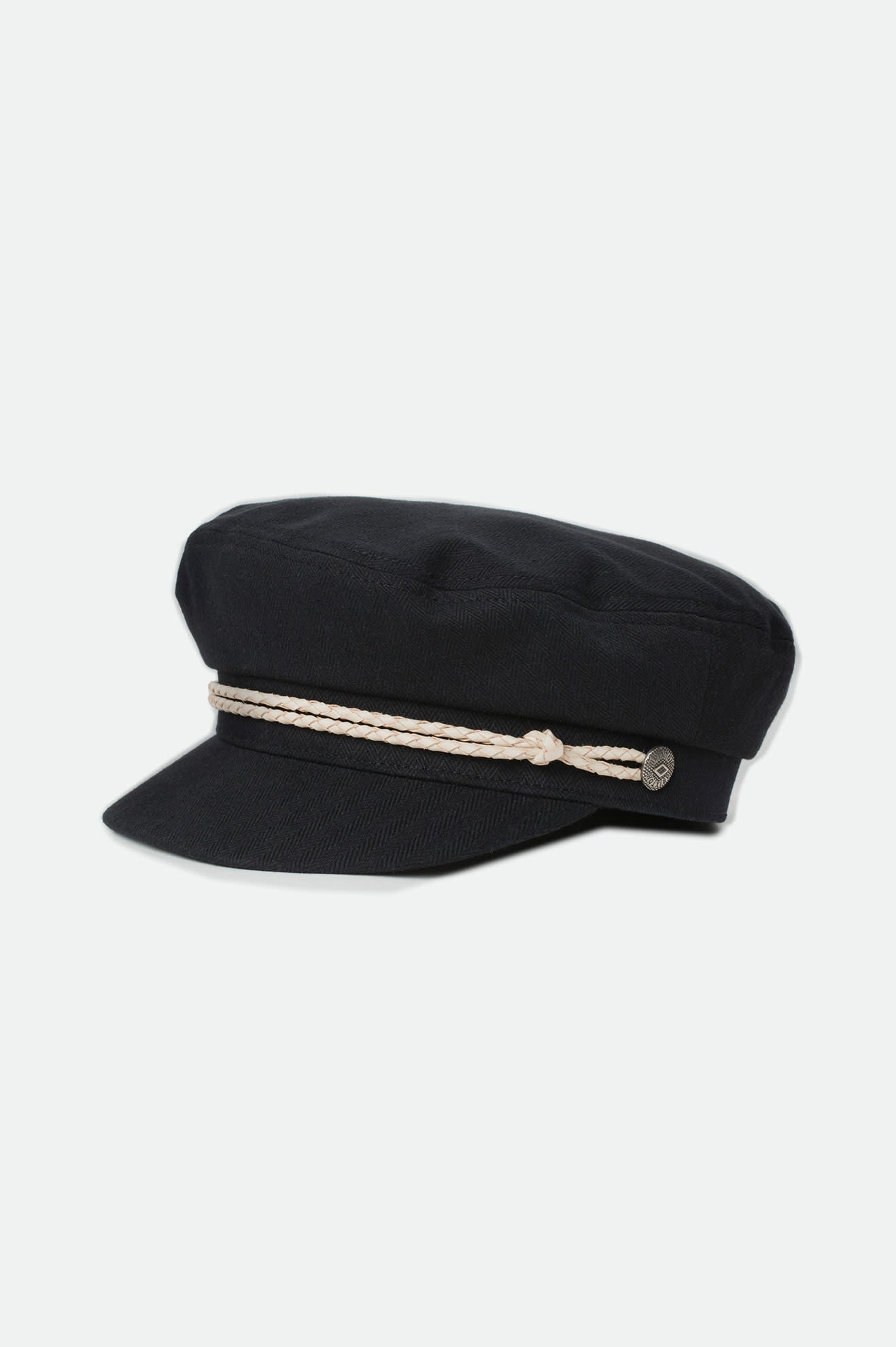 The Ashland Cap is a fisherman cap designed with mixed fabric and featuring both a genuine leather braided band and a metal logo pin.