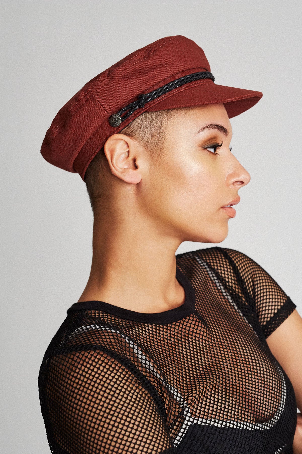 The Ashland Cap is a fisherman cap designed with mixed fabric and featuring both a genuine leather braided band and a metal logo pin.