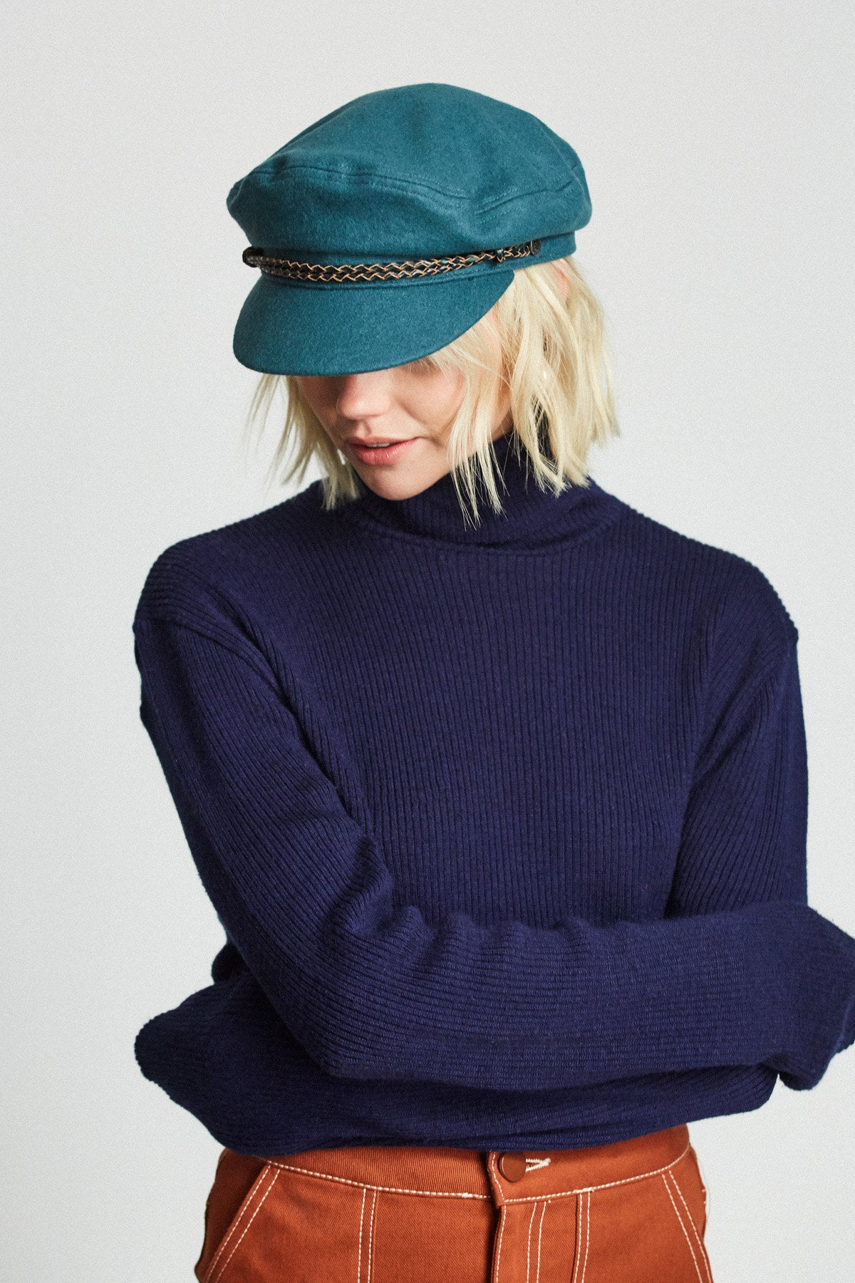 The Ashland Cap is a fisherman cap designed with mixed fabric and featuring both a genuine leather braided band and a metal logo pin.