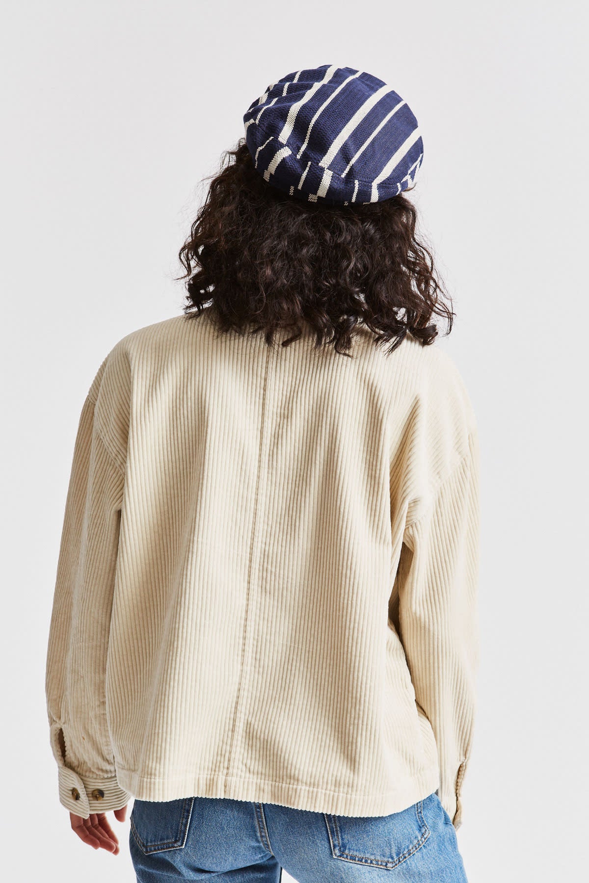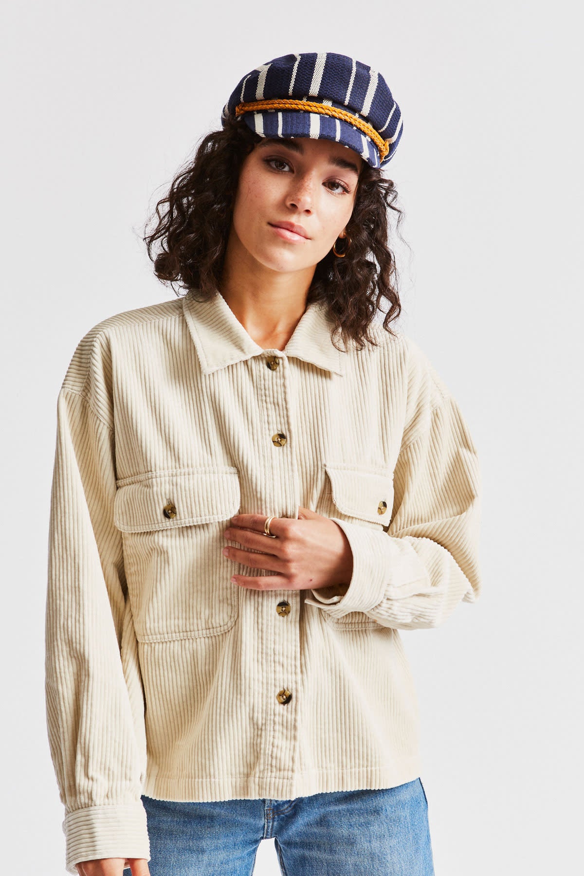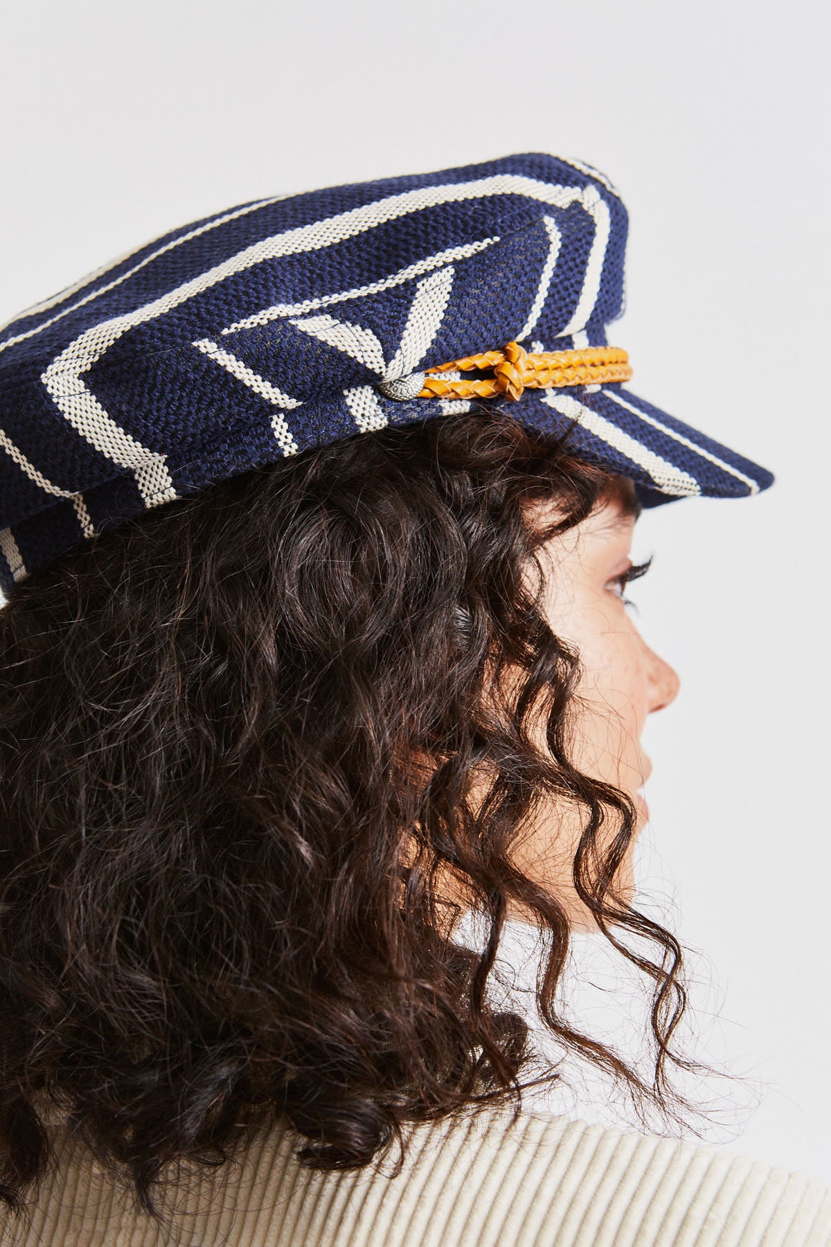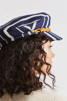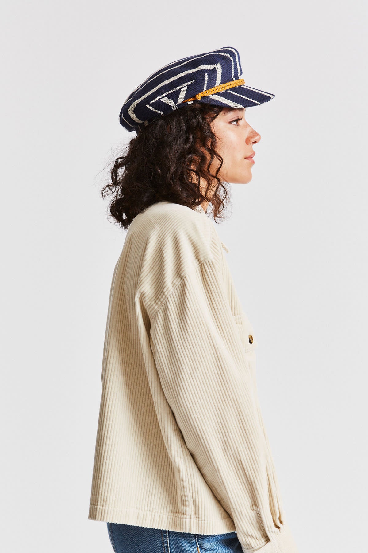 The Ashland Cap is a fisherman cap designed with mixed fabric and featuring both a genuine leather braided band and a metal logo pin.