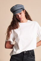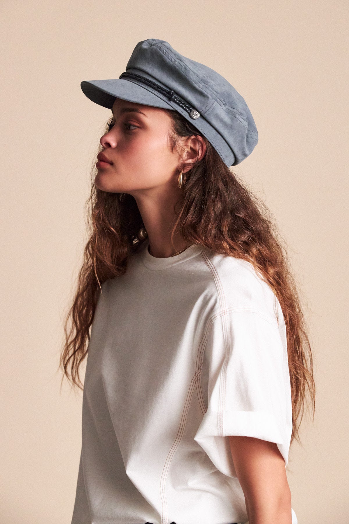 The Ashland Cap is a fisherman cap designed with mixed fabric and featuring both a genuine leather braided band and a metal logo pin.