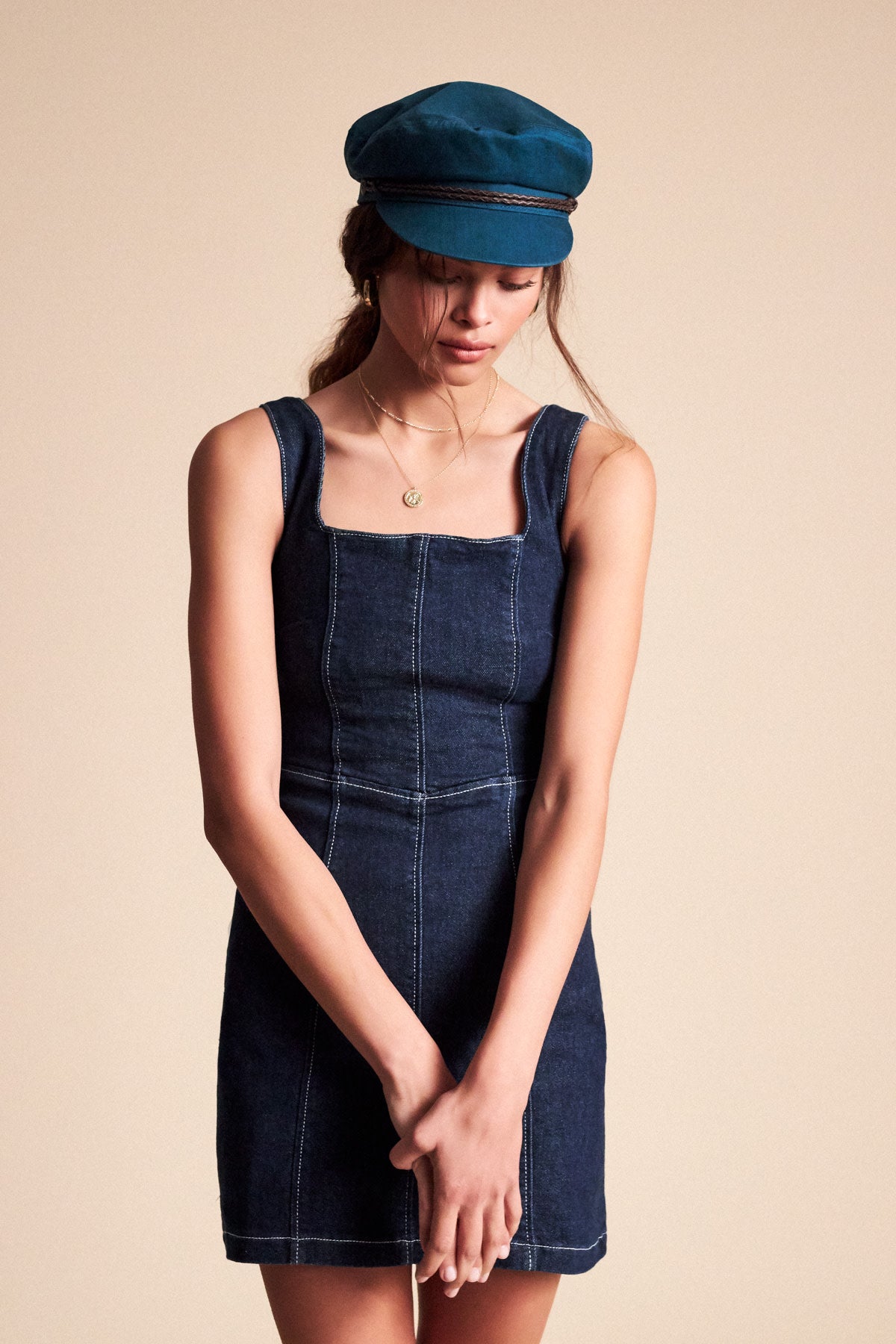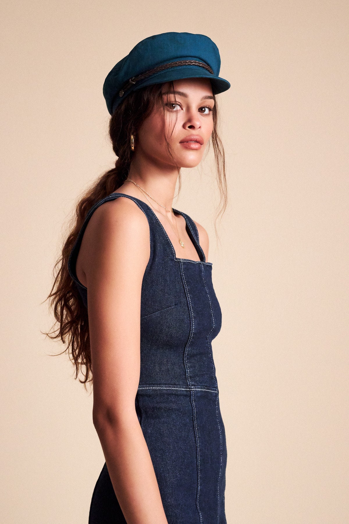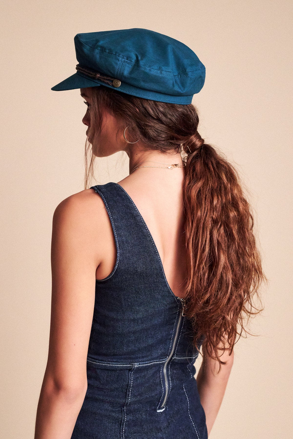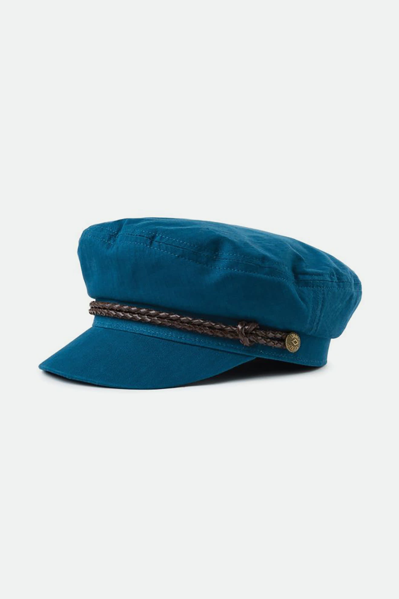The Ashland Cap is a fisherman cap designed with mixed fabric and featuring both a genuine leather braided band and a metal logo pin.