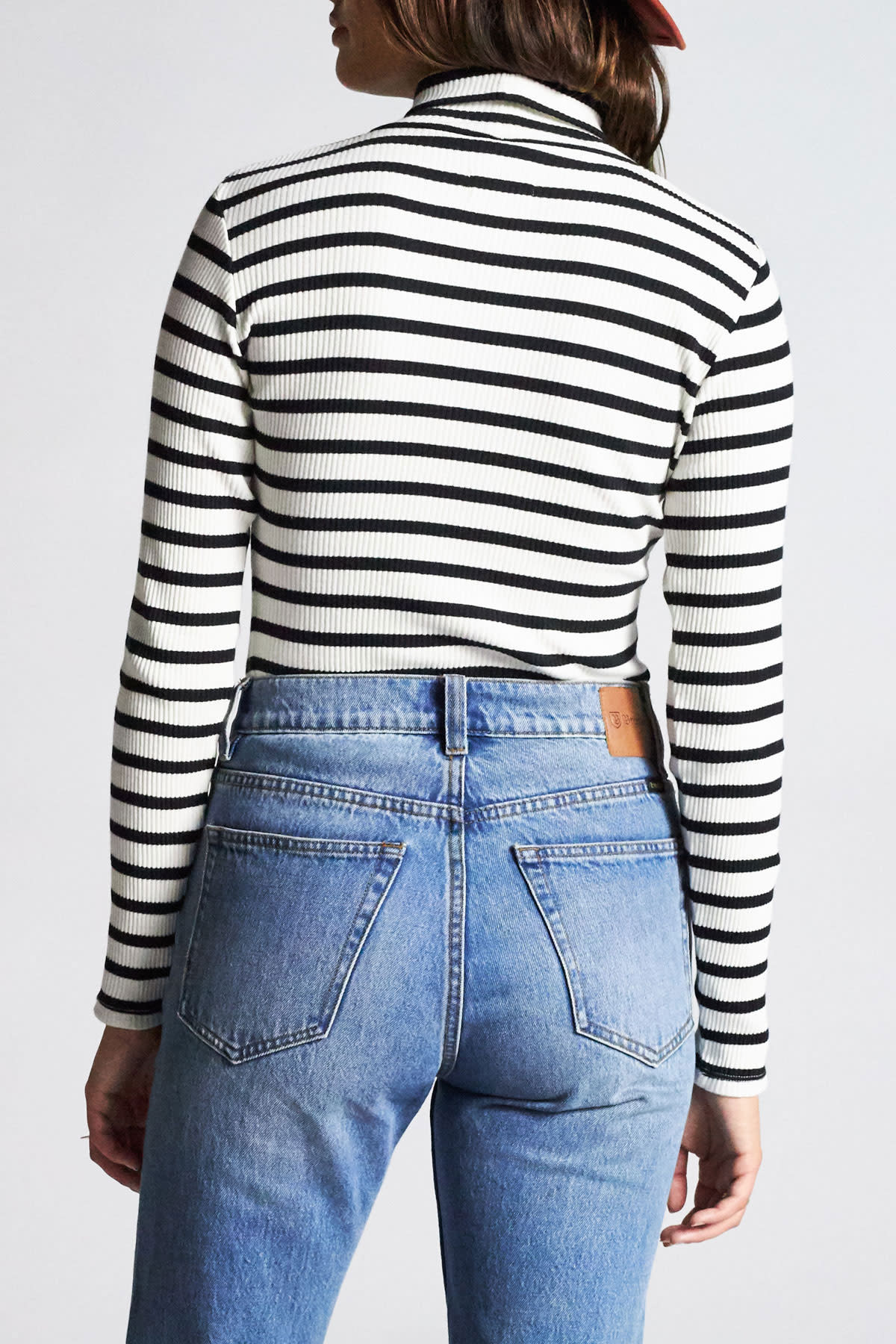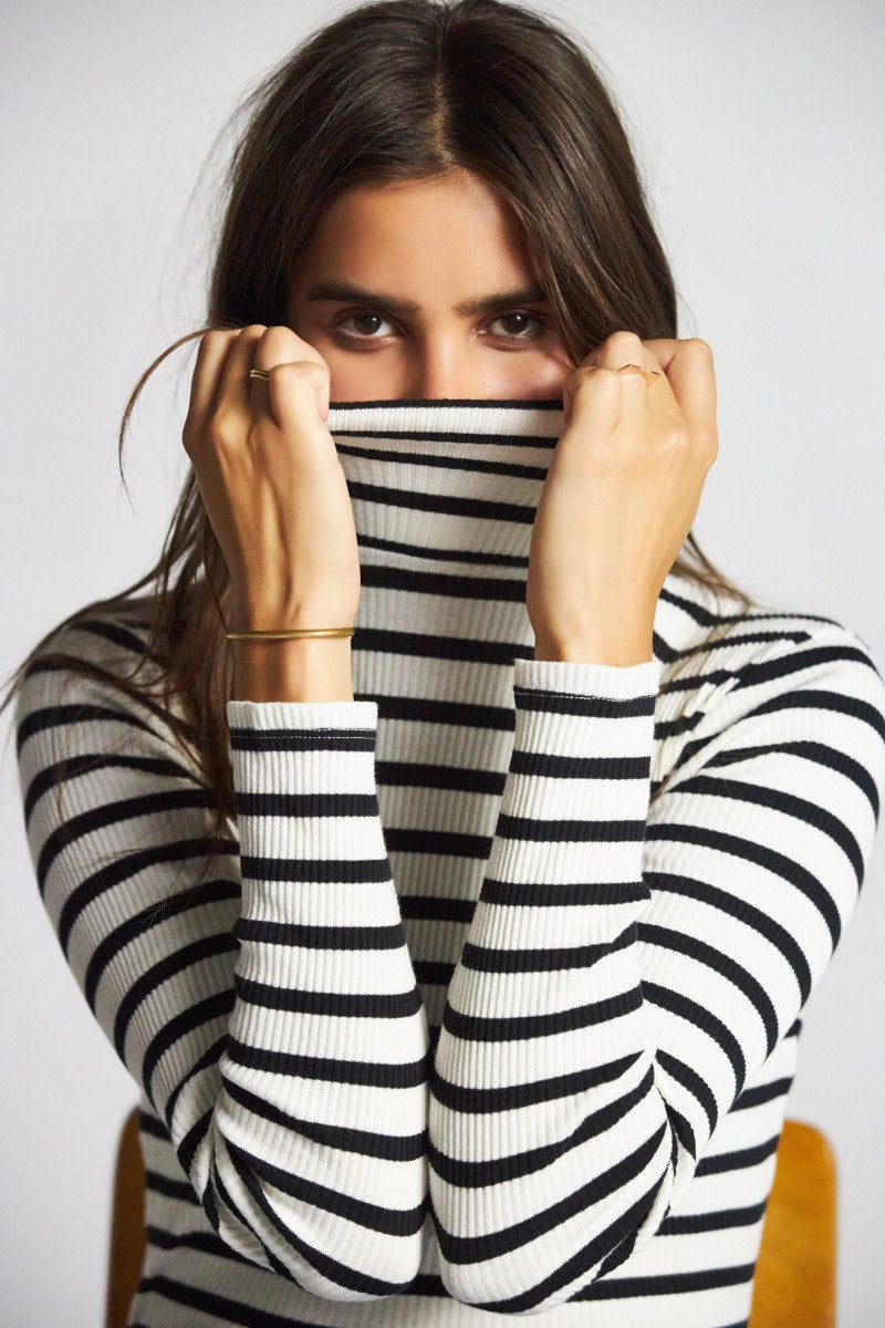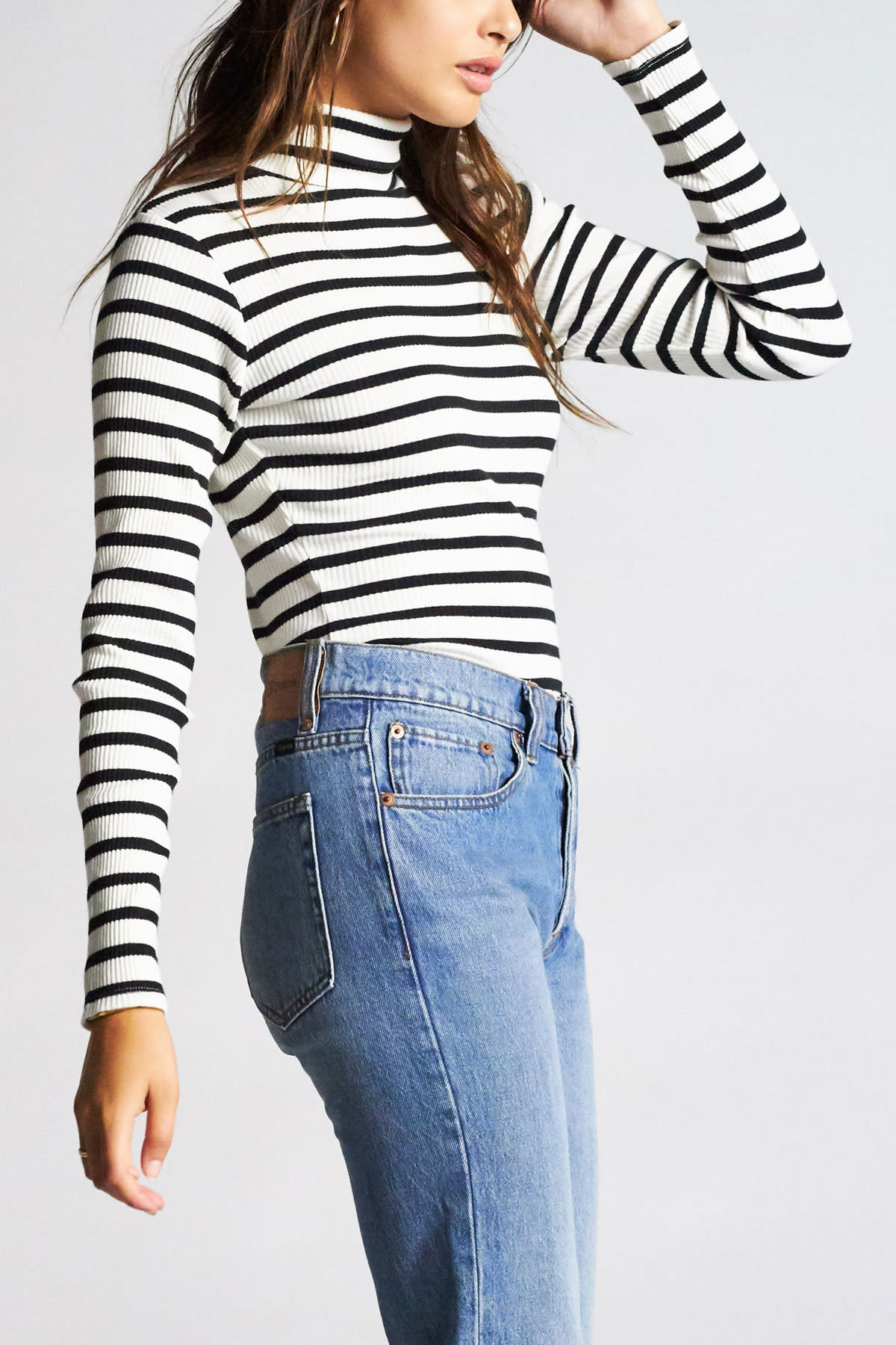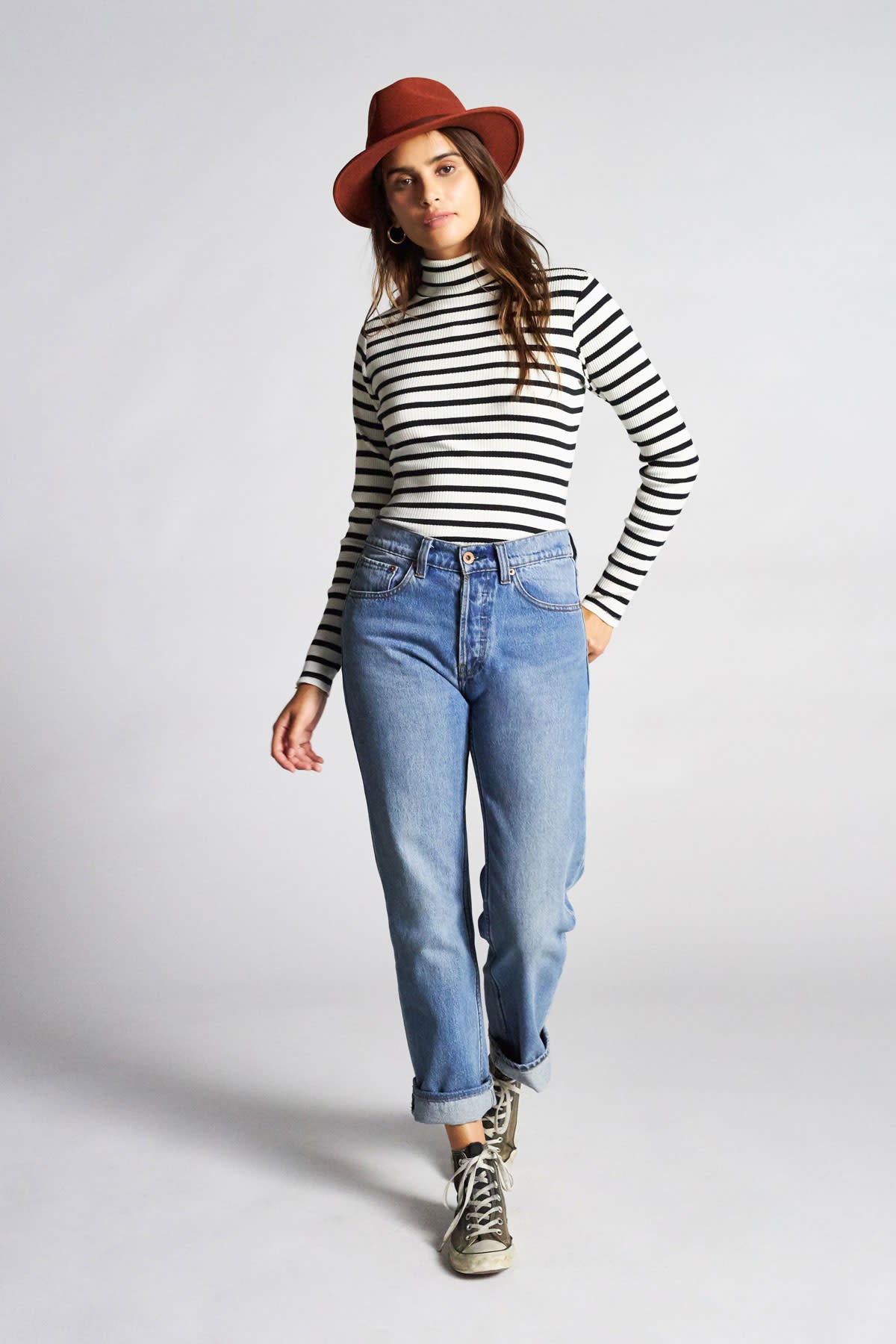 It features a tall neck funnel that can be rolled down or kept high, fitted body and sleeves, and woven Brixton labels.