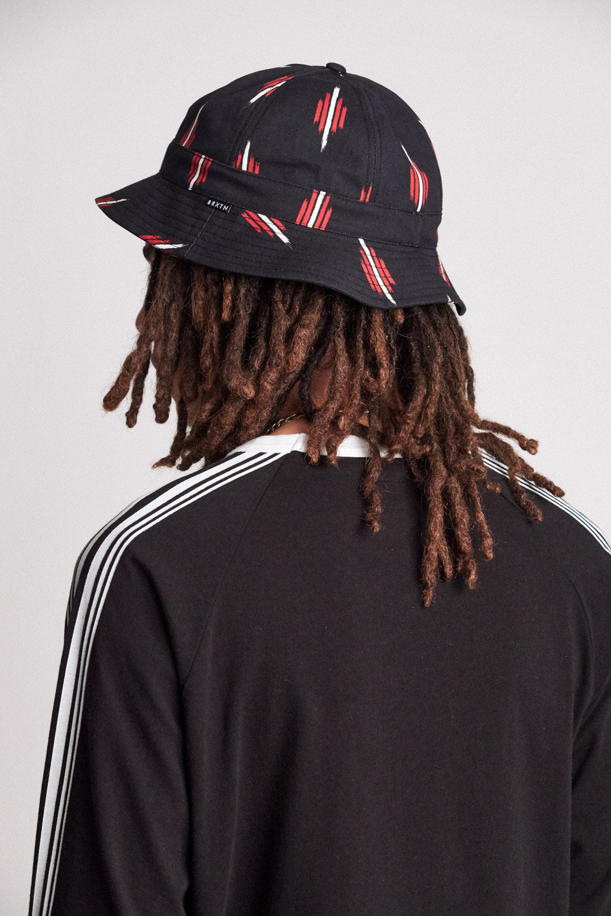 A unisex short-brim round-top cotton bucket hat with a woven Brixton label. Color: Black/Red.