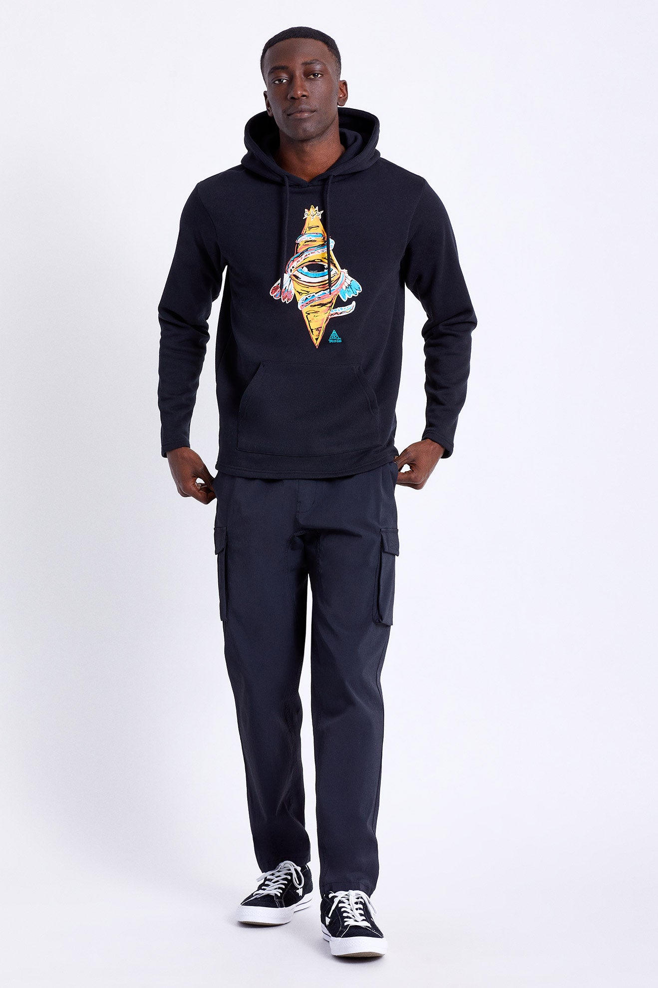 Built with a mid-weight cotton and polyester blend, the standard fit BB Bohemian Hood puts a twist on the typical fleece. Featuring a drawcord hood adjuster for comfort and a puff ink screen print—thanks to artist BB Bastidas—this one is built to turn heads.
