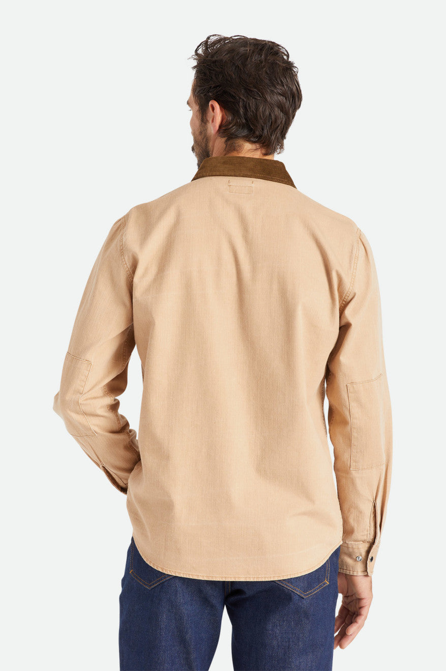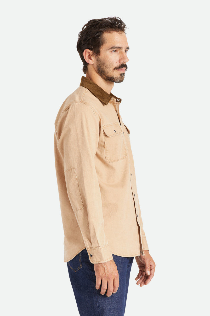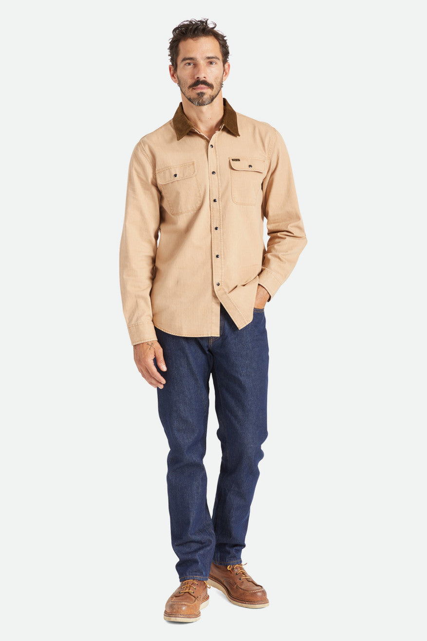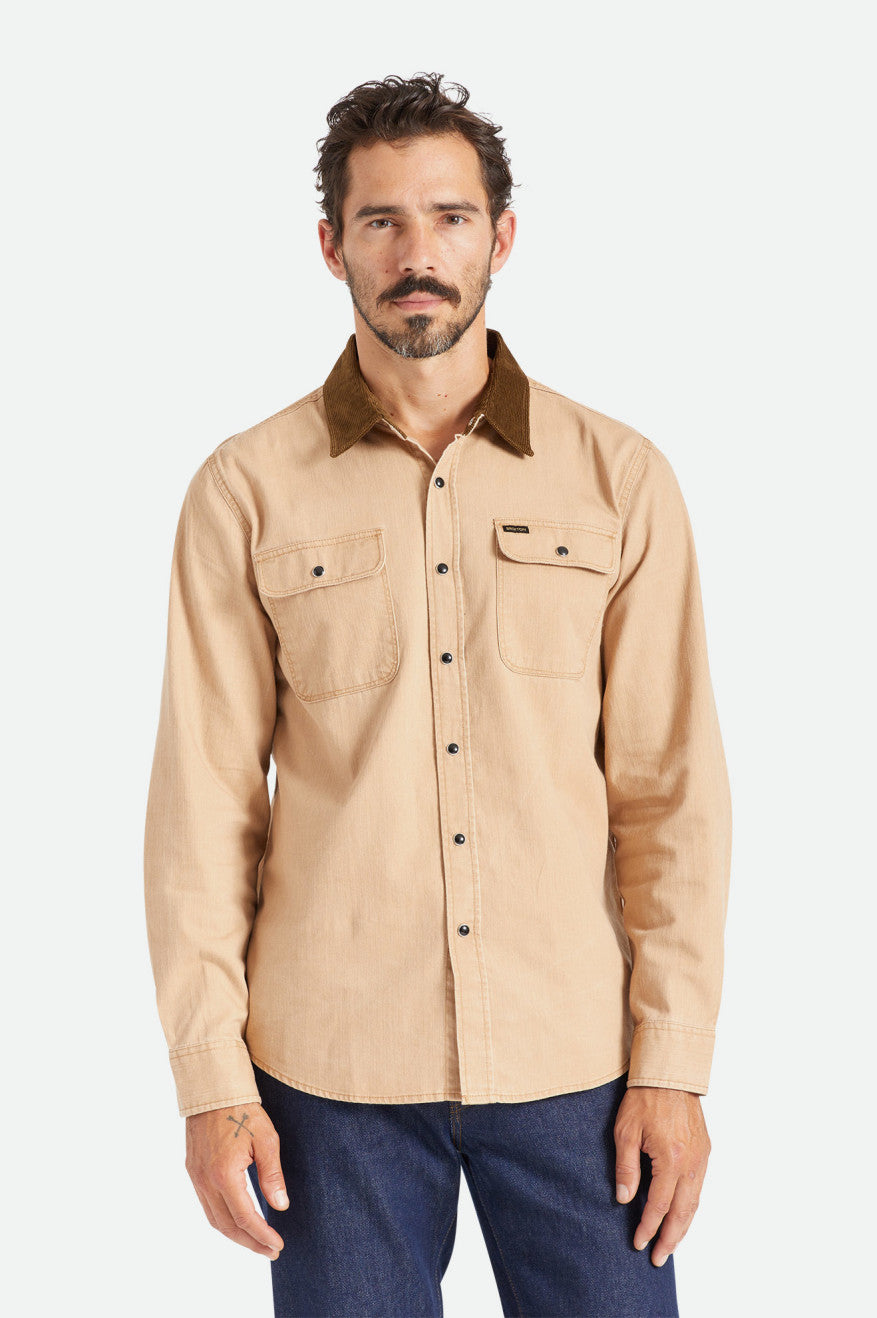 A fresh take on a Brixton staple, the Bowery Reserve L/S Woven adopts Western-inspired influences for understated style. Opting for a seamless yoke, it keeps the dual chest pockets of the classic Bowery but swaps out the front buttons for pearl ring snaps. Elbow patches and a corduroy collar add durability in high-wear areas and the entire garment has been treated with a softener wash for that favorite-shirt feel.