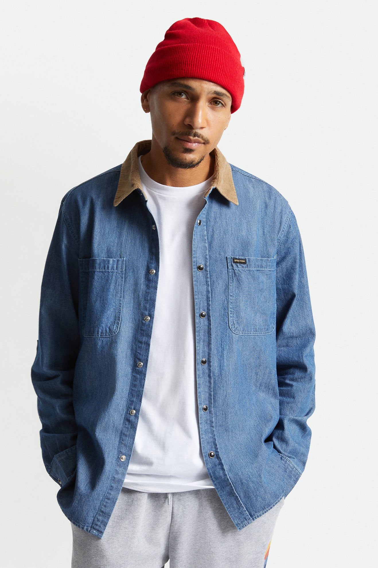 Made from 100% ringspun cotton denim with a worn wash to give it a vintage feel. Featuring a corduroy collar and interior wrist cuffs, and pearl snap buttons. Its durability and classic look make this shirt the perfect everyday layering piece.