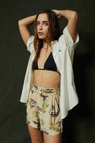 The Paradise Shorts are a match made in heaven for holidays and summer stays. Made with flowing viscose in custom tropical prints. These pair flawlessly with the Bunker Paradise S/S Woven or any crop in your closet. Featuring an elasticized waistband for a seamless fit.