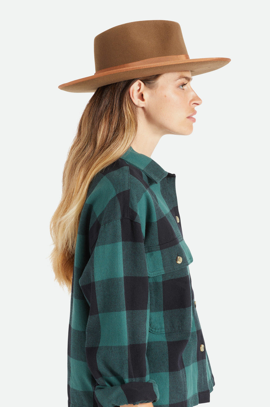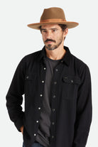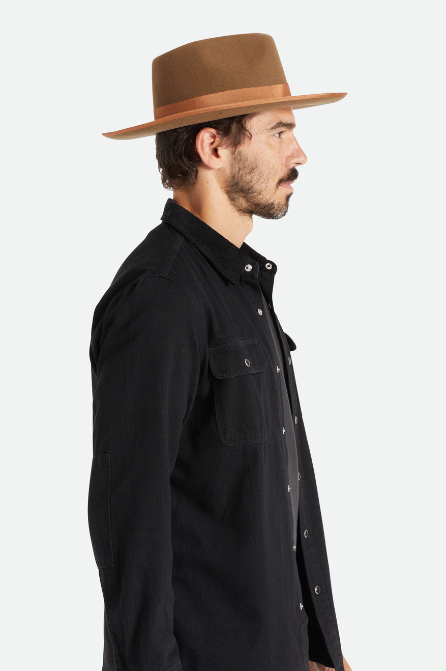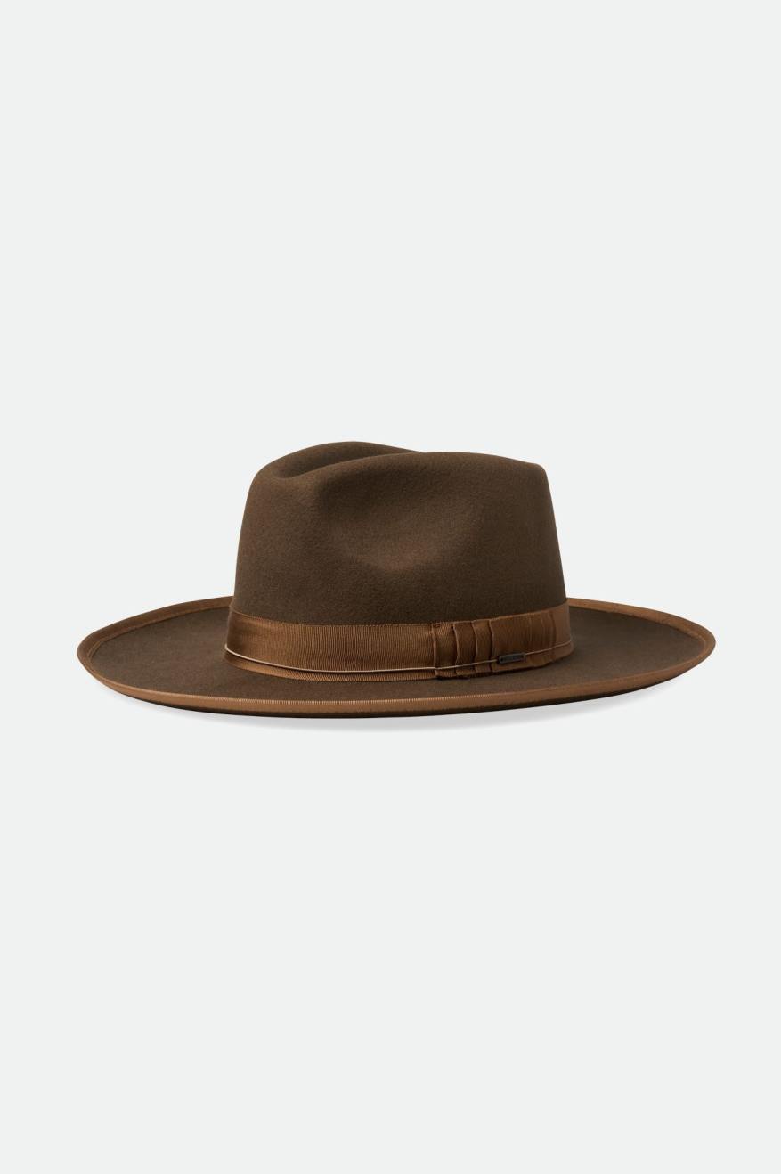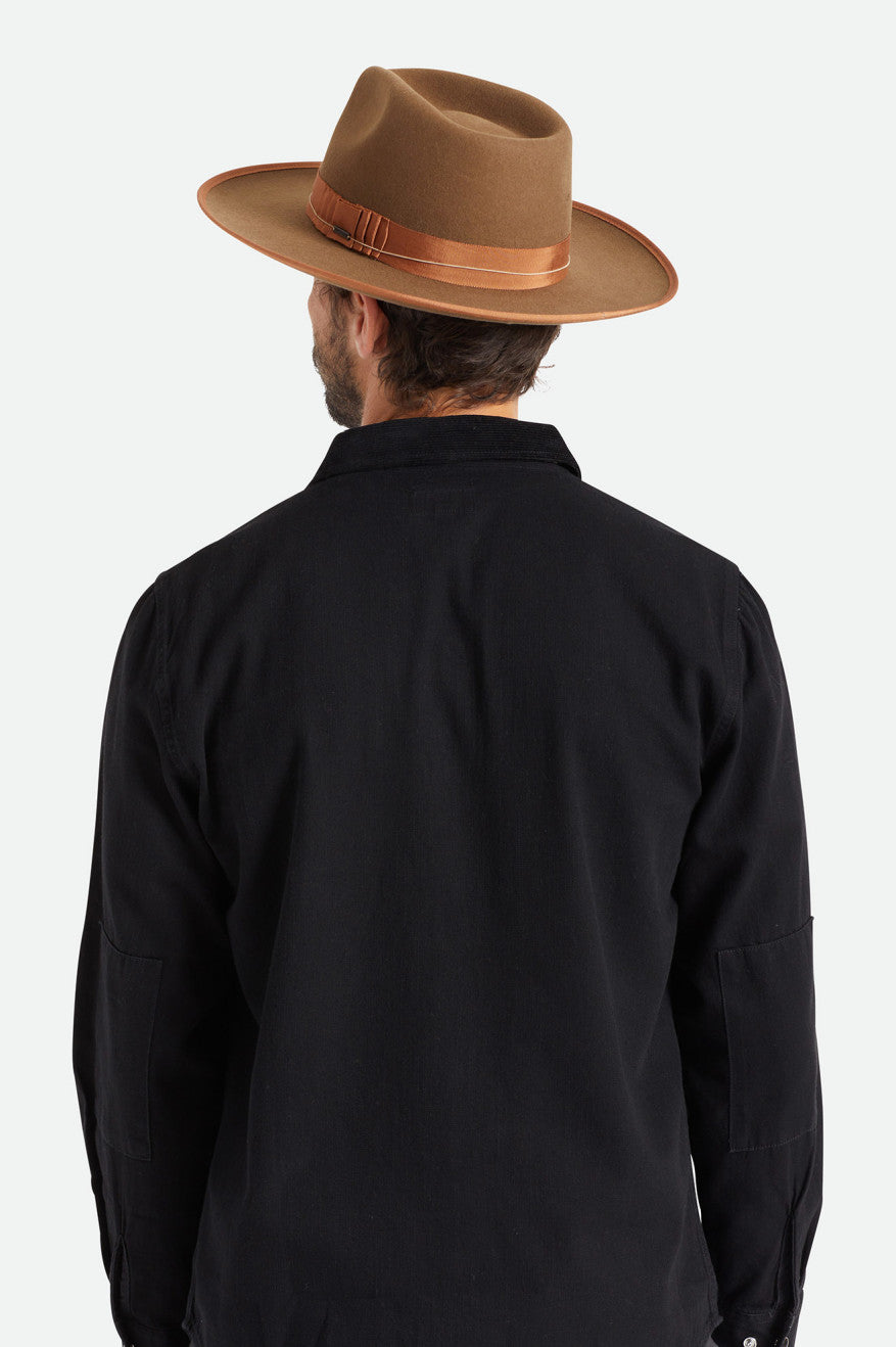 The Reno Fedora is a modern take on a heritage style. It has an iconic teardrop crease and a symmetrical front pinch. Made with Australian wool with a layered grosgrain band and brim taping.
