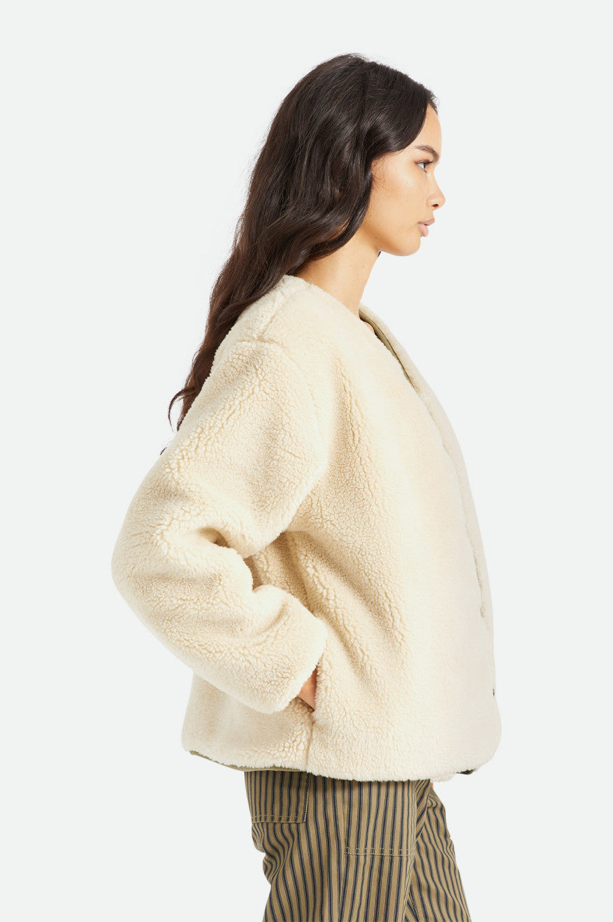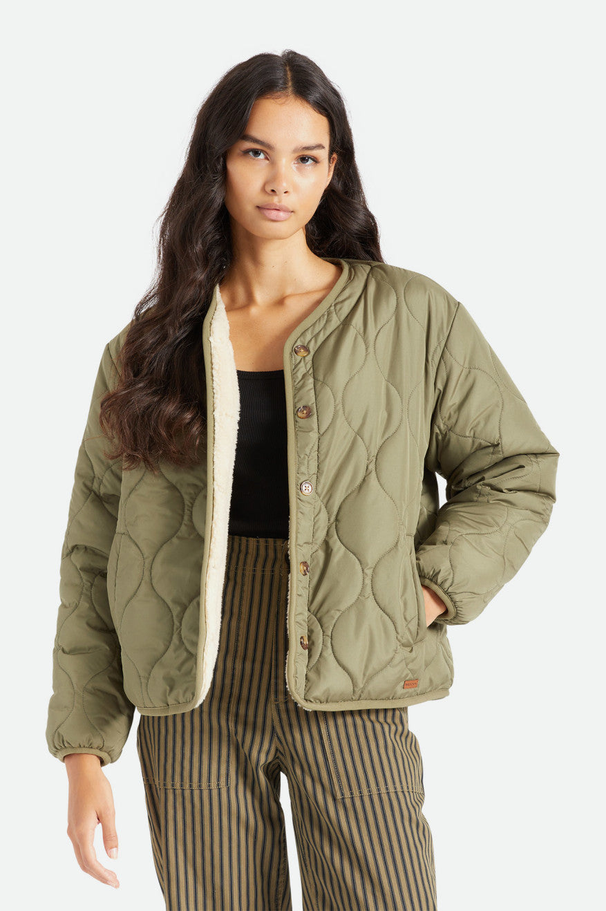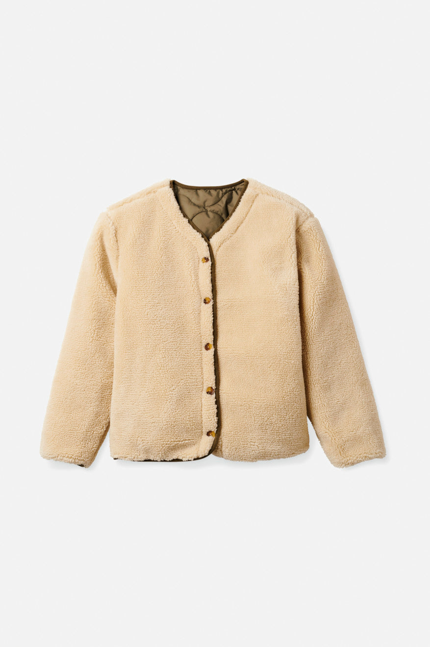 Like the perfect vintage piece you've been searching for, this is a bomber-inspired jacket with a just-right fit. The interior is lined with cozy sherpa fleece while the exterior boasts textured onion quilting. Reverse the jacket to show the fuzzy finish and turn your new favorite into a neutral layer. Detailed with horn buttons and elastic sleeve cuffs.