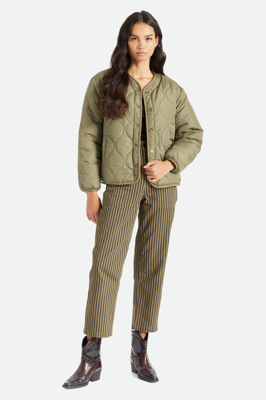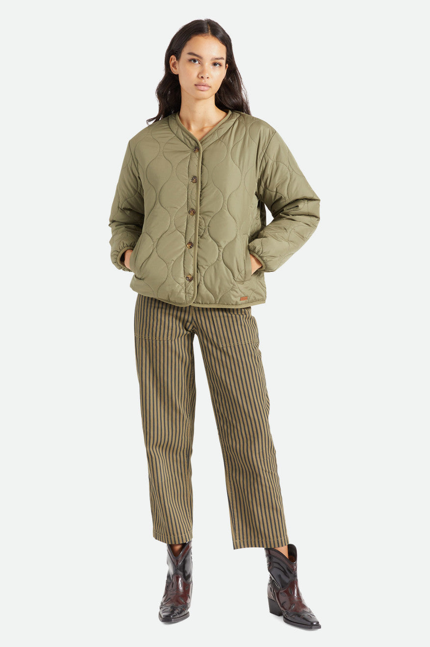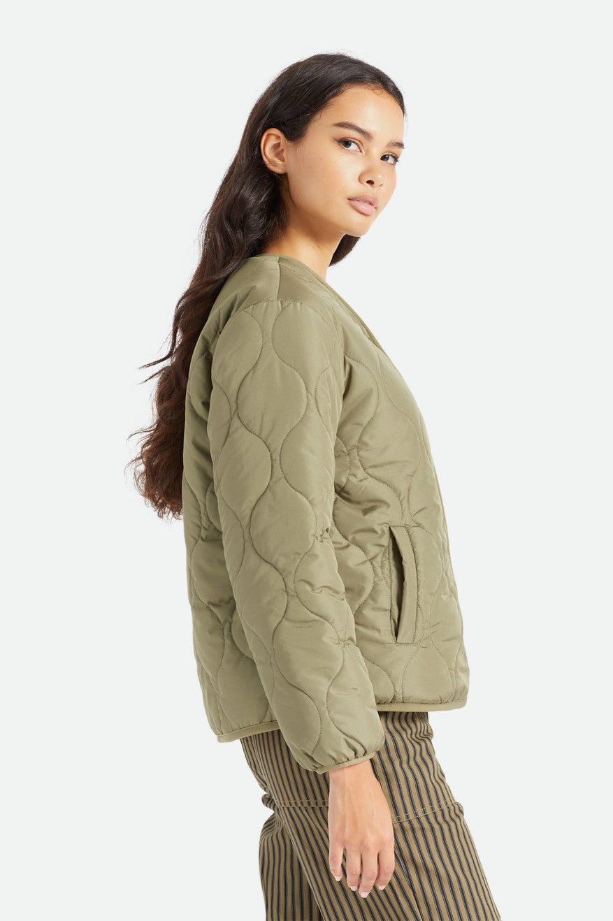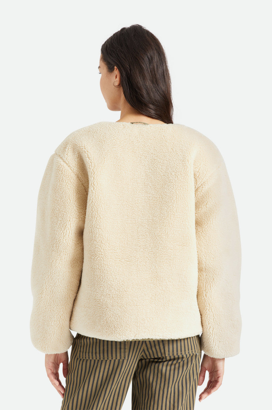 Like the perfect vintage piece you've been searching for, this is a bomber-inspired jacket with a just-right fit. The interior is lined with cozy sherpa fleece while the exterior boasts textured onion quilting. Reverse the jacket to show the fuzzy finish and turn your new favorite into a neutral layer. Detailed with horn buttons and elastic sleeve cuffs.